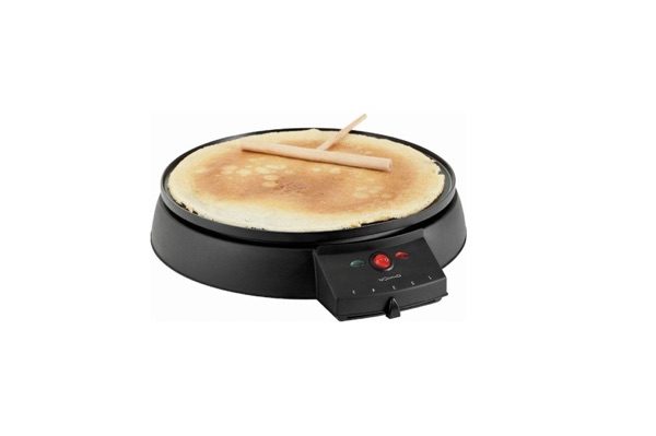 Crêpière, deux indicateurs lumineux de fonctionnement, température réglable, pieds en silicone pour une meilleure stabilité, livrée avec le répartiteur de pâte.