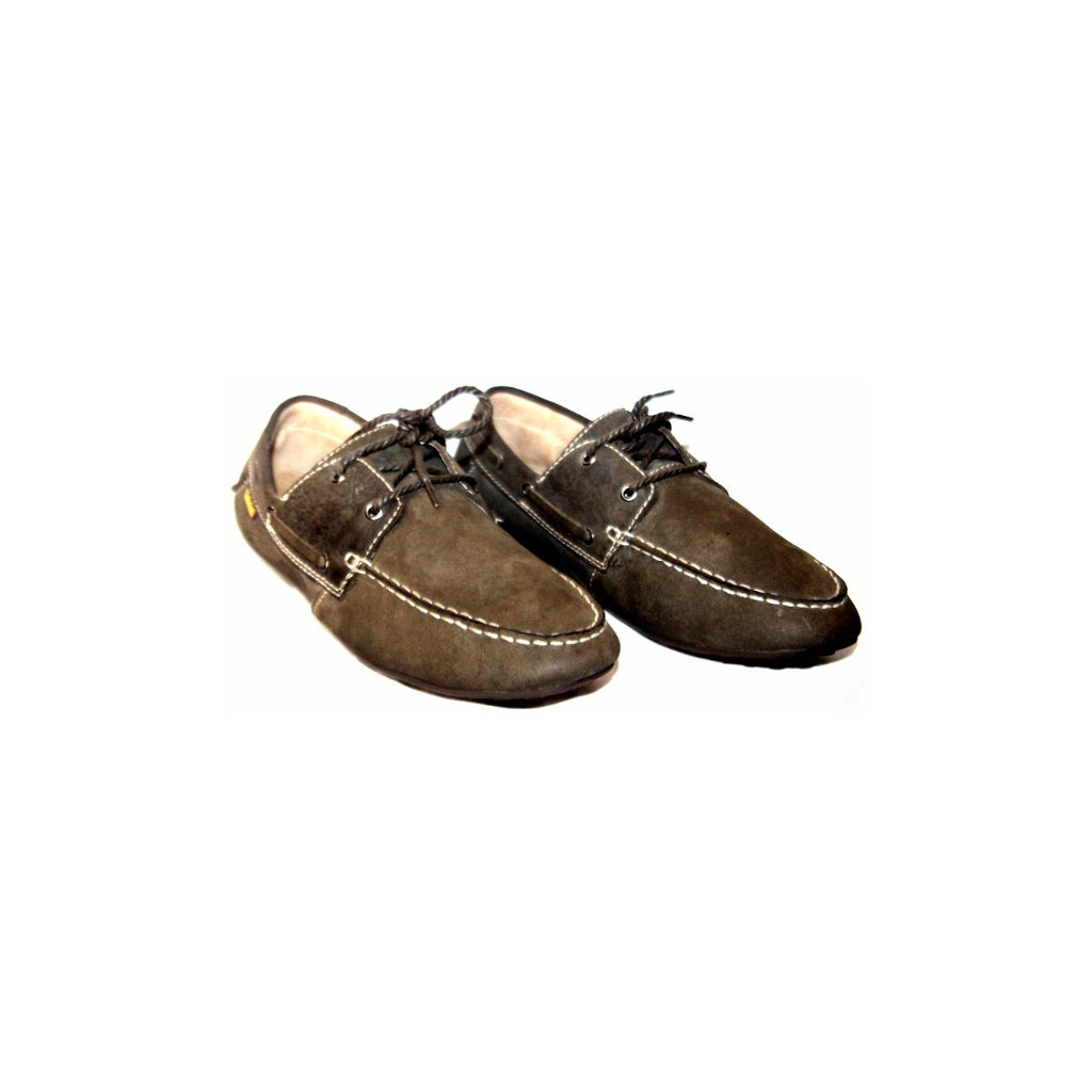 Mocassin coupe en tissu avec lacets et pointe arrondie avec coutures apparentes et semelle en cuir véritable et caoutchouc.